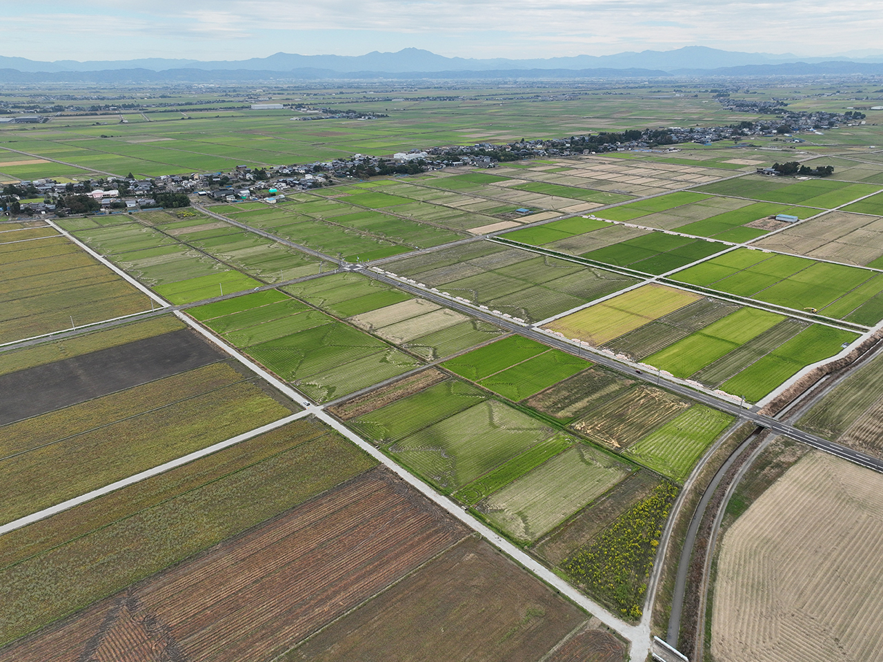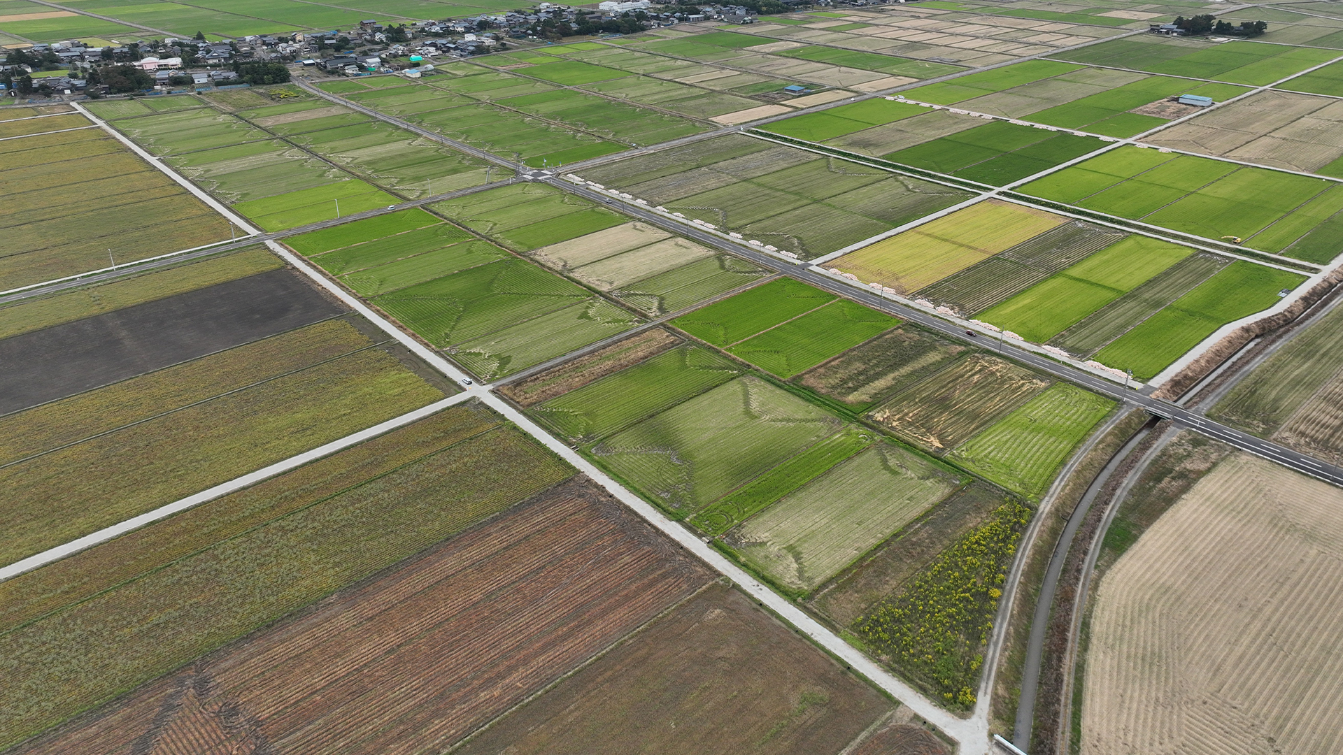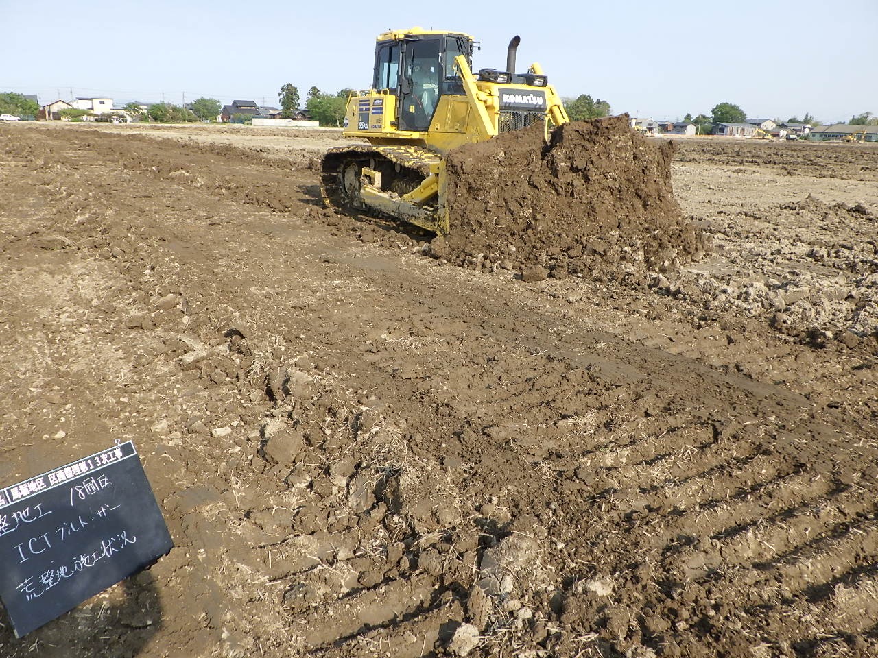 CT施工による整地工。事前に図面データをブルドーザーに入力し、人工衛星で重機の位置をとらえ、モニターを見ながら施工をしていく為、従来の赤外線レーザーが必要無く、畦畔の測量も省く事が出来ました。